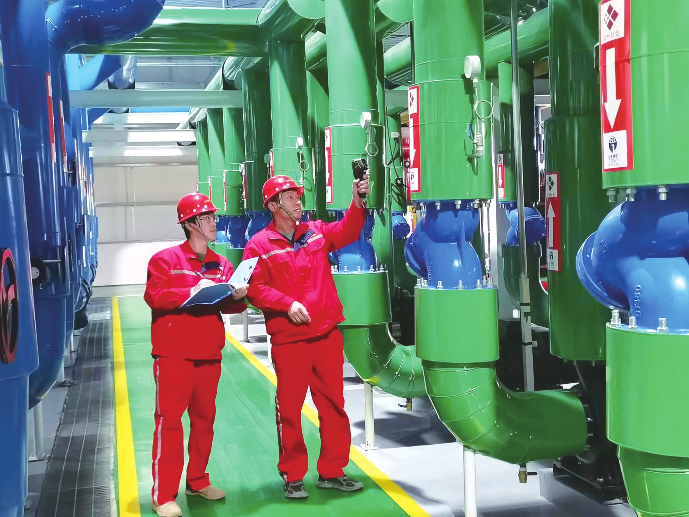 工作人員檢查地?zé)峁┡O(shè)備運(yùn)行情況