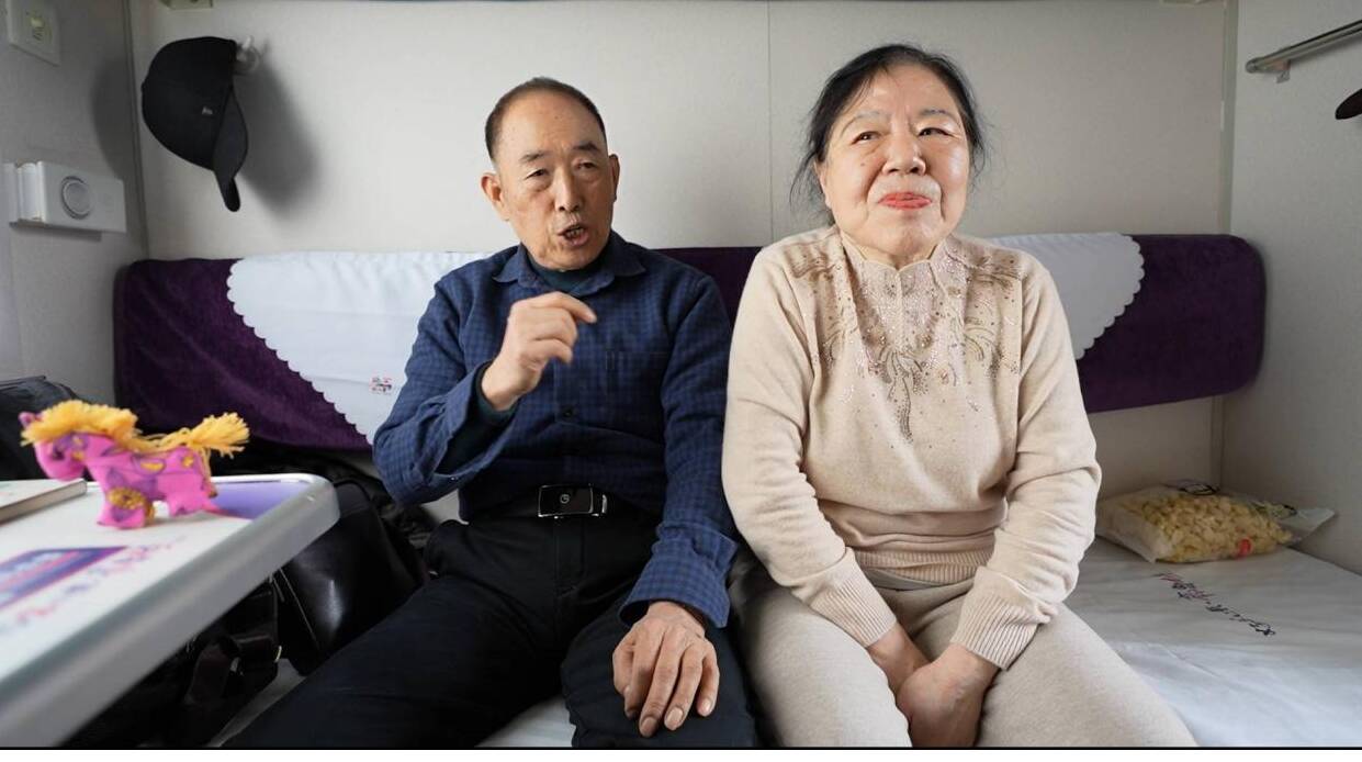 (臥鋪車廂里,老兩口向記者分享他們的故事)