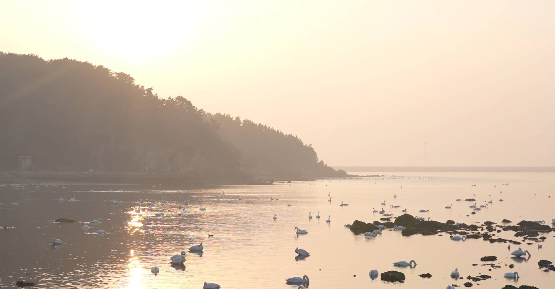 伴隨著日出,老兩口終于到達(dá)了威海市煙墩角村,這是聯(lián)合國評選出來的世界最佳旅游鄉(xiāng)村,大天鵝已經(jīng)從西伯利亞等地結(jié)伴而來??刺禊Z的最佳時(shí)間終于到了。老兩口情不自禁地說:“咱們回去了,回到了我們兩個(gè)人的世界?!?/p>