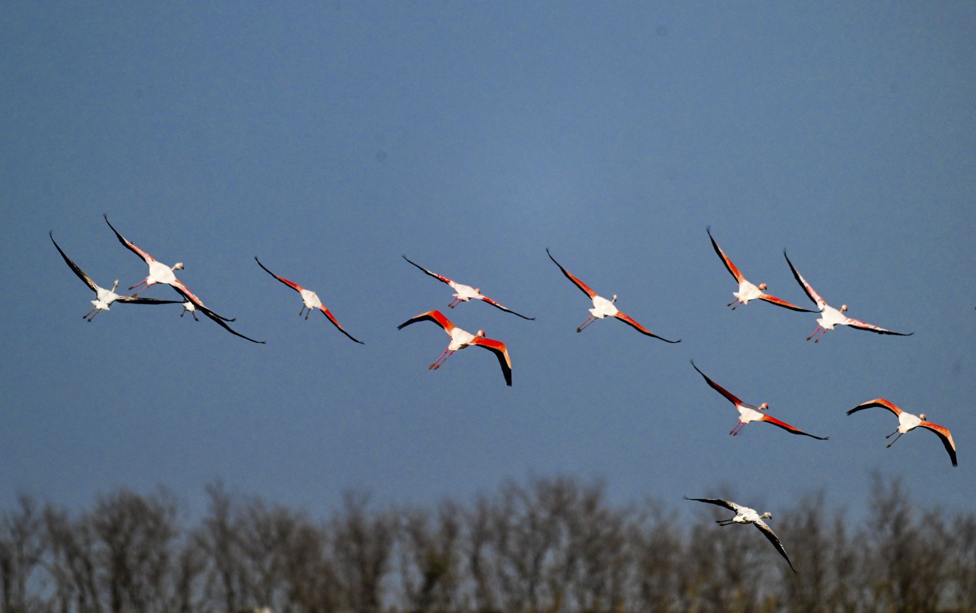 近日,一群火烈鳥陸續(xù)飛抵江蘇東臺條子泥濕地。據(jù)了解,自2015年起,火烈鳥已連續(xù)11年來此越冬。由于條子泥濕地保護(hù)和修復(fù)不斷加強(qiáng),生態(tài)環(huán)境持續(xù)向好,火烈鳥數(shù)量逐年增加。