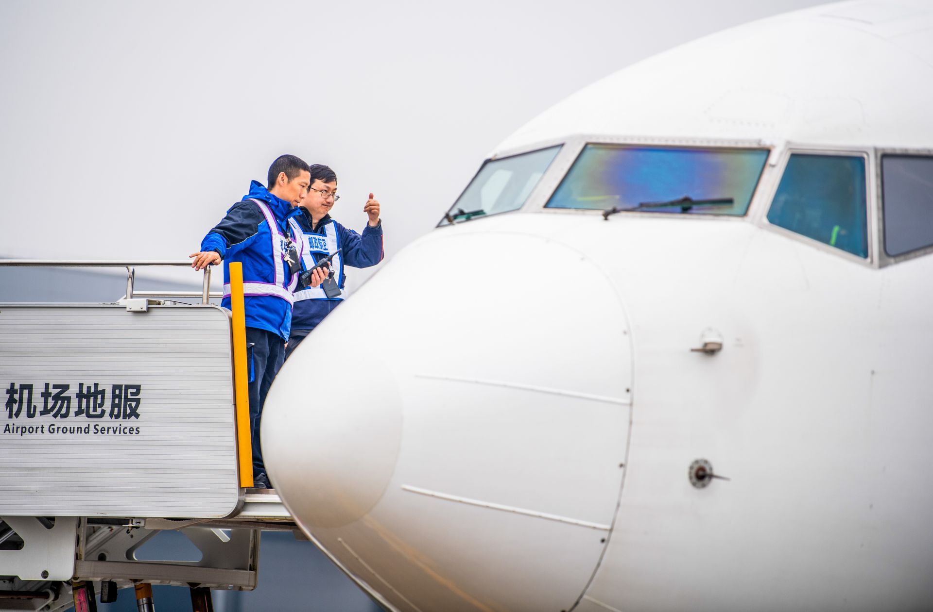 12月9日,工作人員進(jìn)行中國(guó)郵政“重慶至仰光”國(guó)際貨郵航線首航貨機(jī)起飛前的準(zhǔn)備工作。