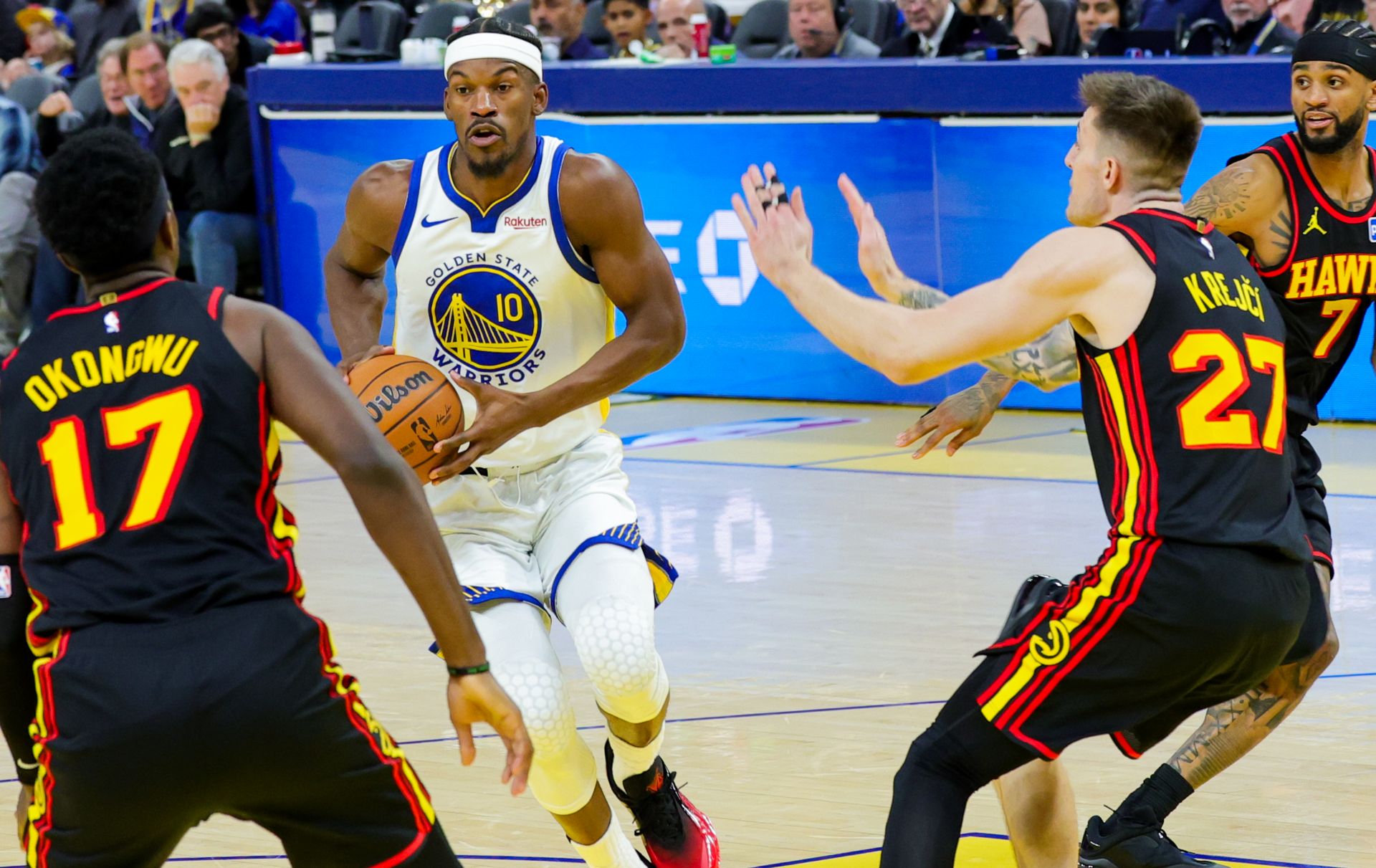 1月11日,勇士隊(duì)球員巴特勒(左二)在比賽中進(jìn)攻。