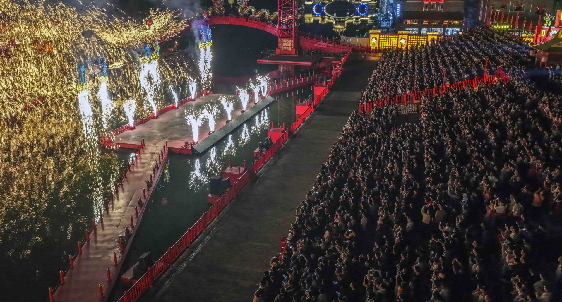 2025年10月7日晚,游客在河北省唐山市豐南區(qū)河頭老街景區(qū)觀看演出(無人機照片)。