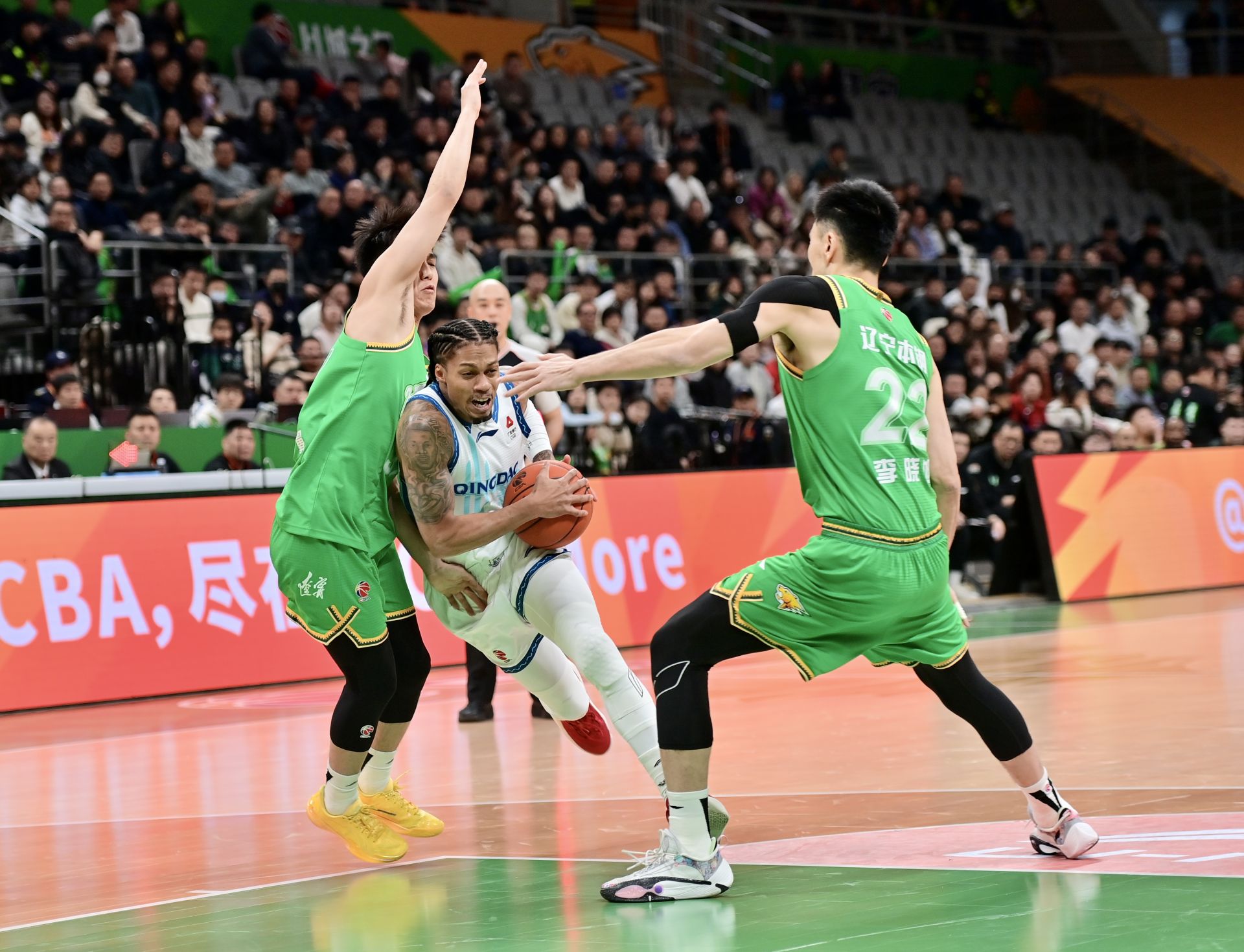 1月13日,青島嶗山啤酒隊(duì)球員約瑟夫·楊(中)在比賽中帶球突破。