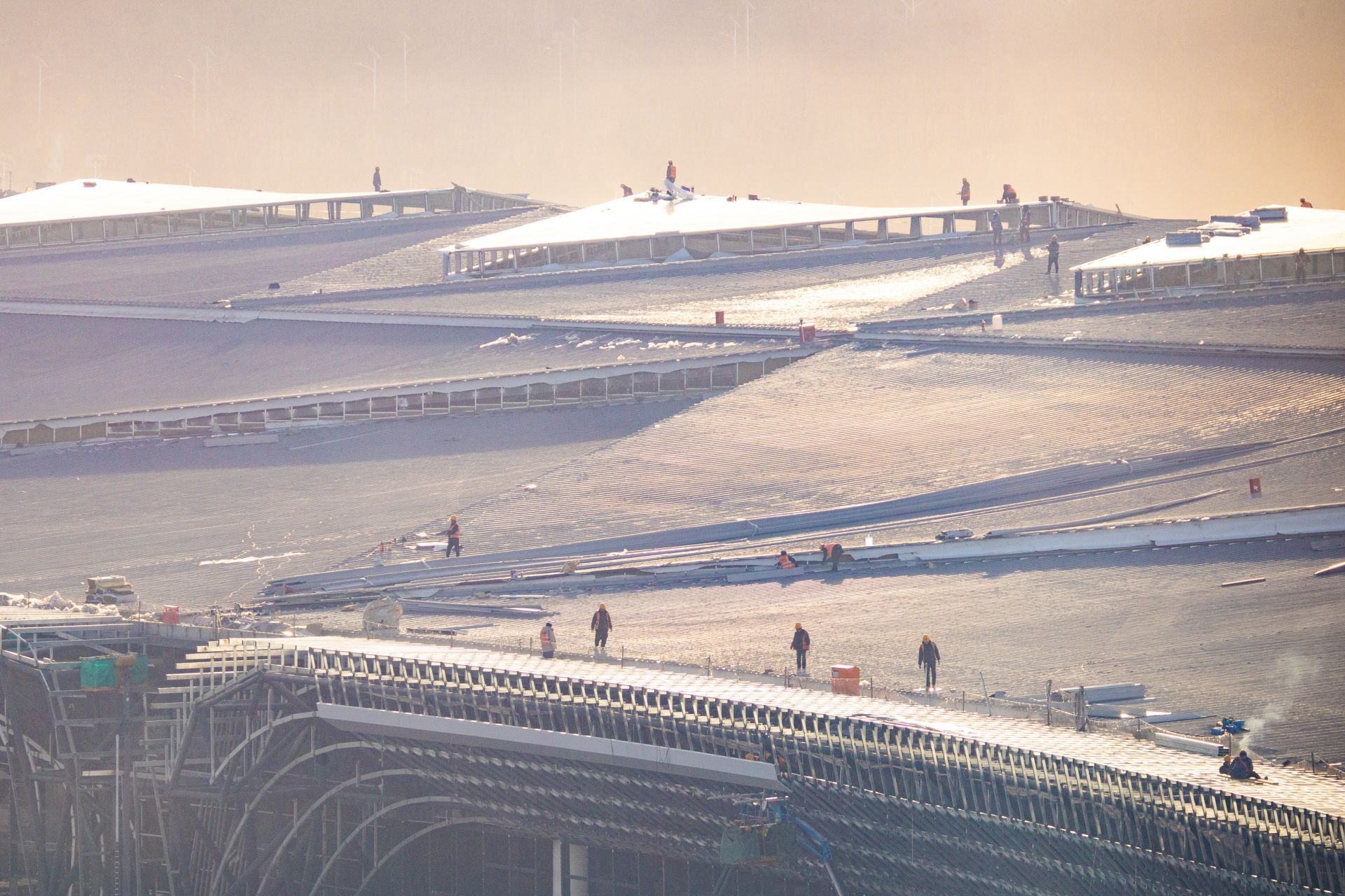 1月15日,施工人員在西安東站金屬屋面進(jìn)行部件安裝作業(yè)。