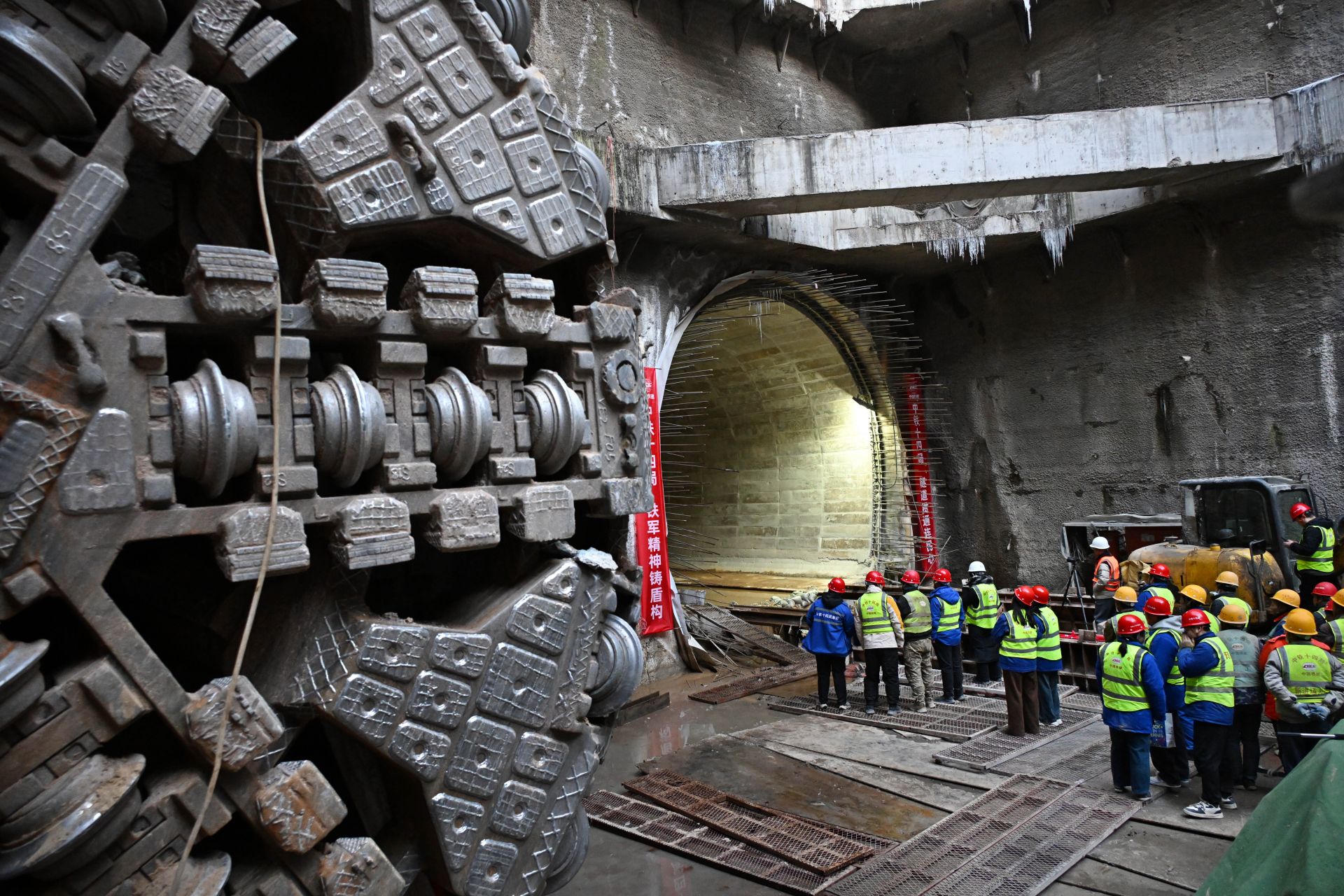 1月21日,建設(shè)者在青島地鐵5號(hào)線四方廠站接收井等待右線貫通。