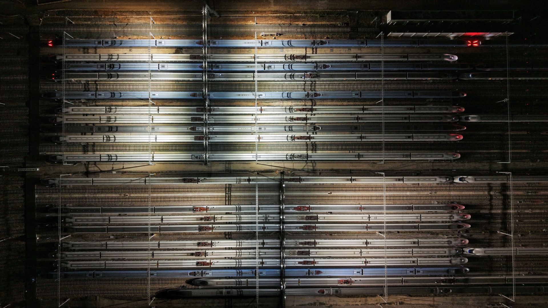 這是1月25日凌晨在昆明車輛段昆明南動(dòng)車運(yùn)用所拍攝的動(dòng)車組列車(無(wú)人機(jī)照片)。