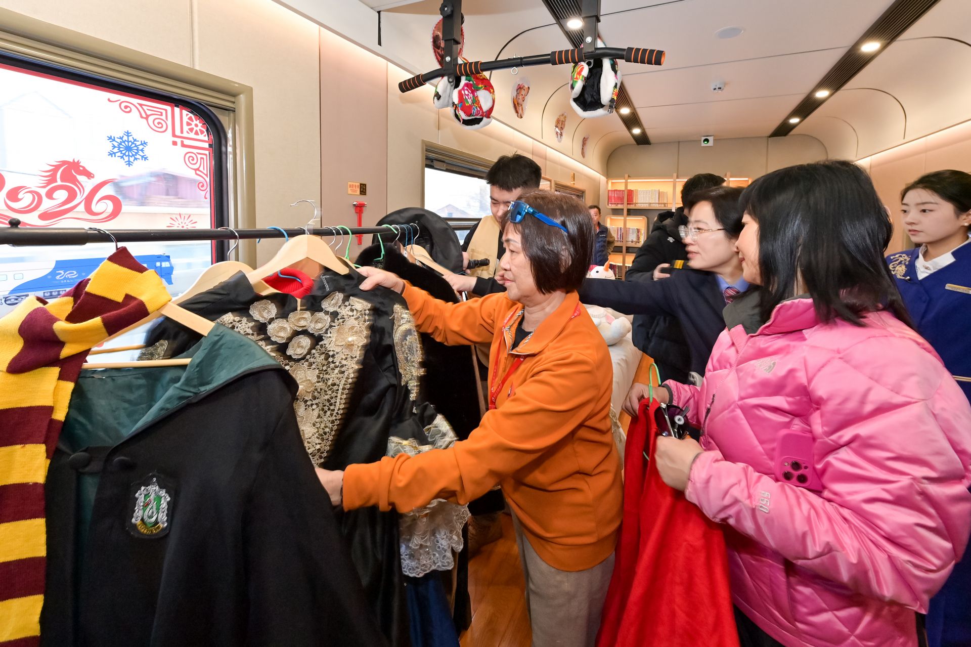 1月25日,旅客在Y783次“悠享龍江·銀旅號(hào)”列車上挑選旅拍服飾。