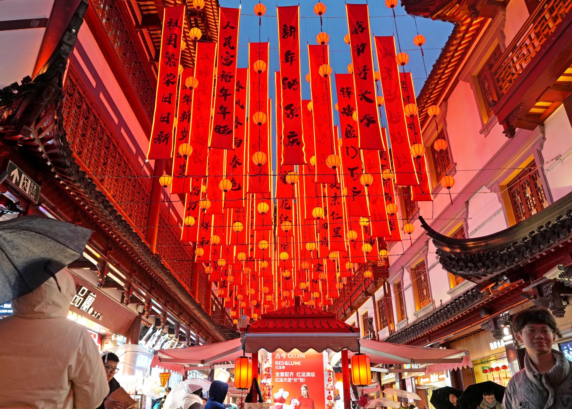 1月26日,豫園燈會(huì)上的春聯(lián)與流光溢彩的花燈營(yíng)造出新春的喜慶氛圍。