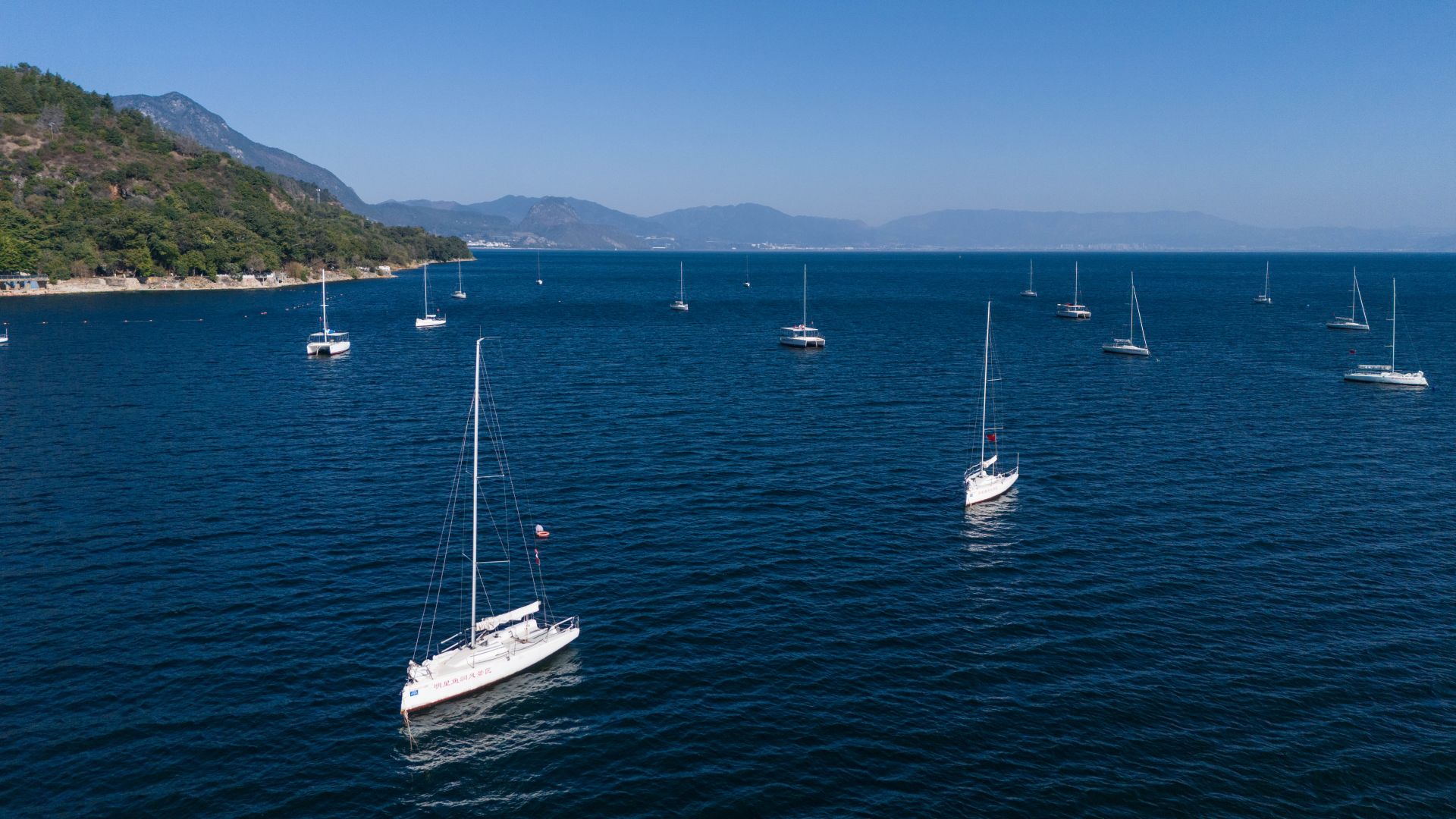 1月27日在云南省玉溪市拍攝的撫仙湖上的游船(無人機照片)。