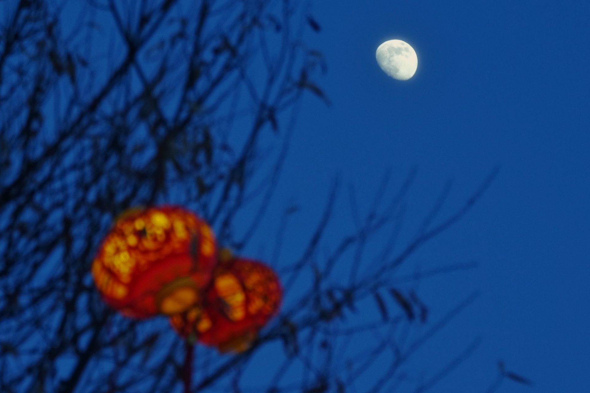 1月29日,在黑龍江省同江市,燈籠與月亮相映成趣。