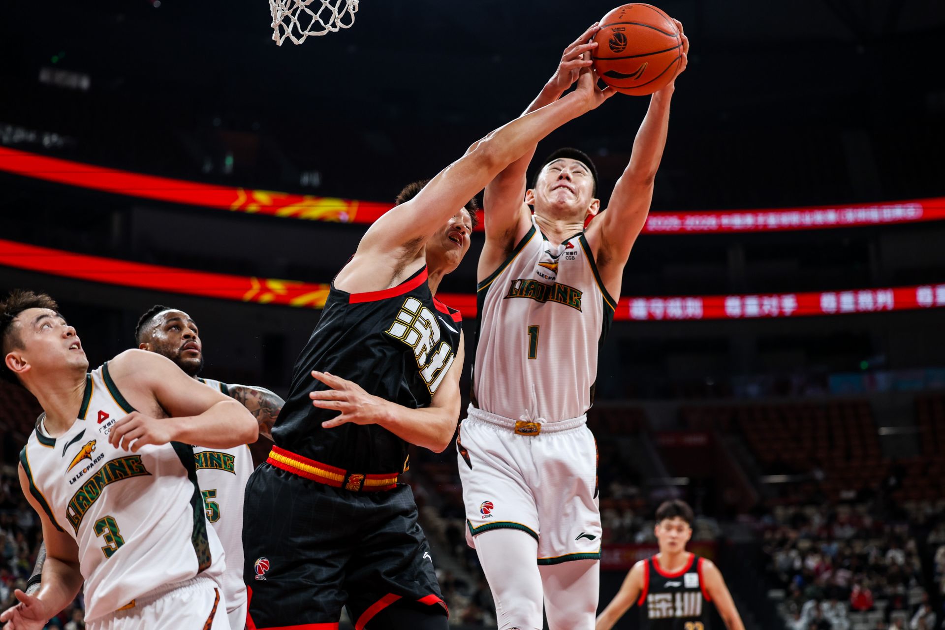 3月11日,遼寧本鋼隊球員付豪(右一)在比賽中與深圳馬可波羅隊球員周鵬(右二)爭搶籃板。