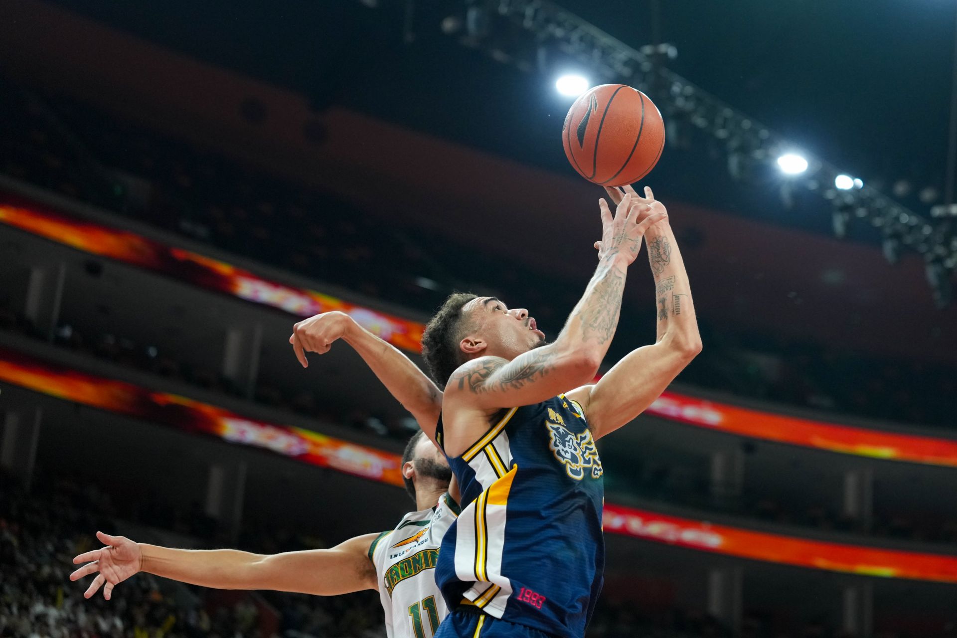 3月15日,廣東東陽(yáng)光隊(duì)球員奎因(右)在比賽中進(jìn)攻。