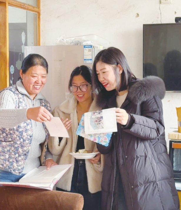 于新新(右)和家人一起翻看老照片