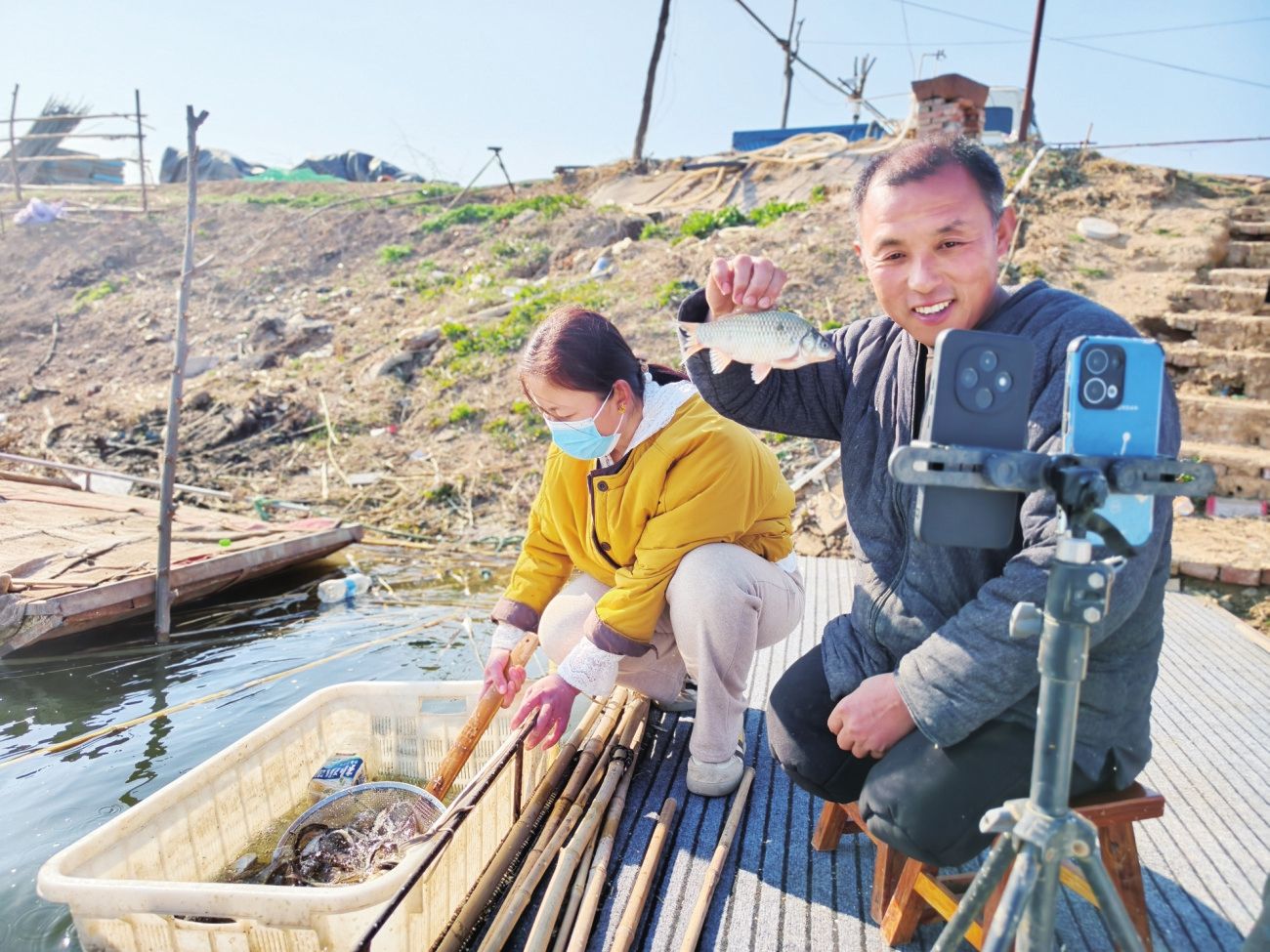 安鵬飛(右)直播展示捕魚成果