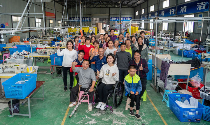 2020年10月13日,在湖南省邵陽(yáng)市城步縣湖南七七科技股份有限公司生產(chǎn)車間,楊淑亭(前排中)與工友合影。新華社記者 才揚(yáng) 攝