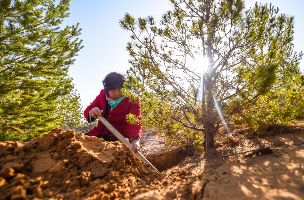2021年3月23日,殷玉珍在內(nèi)蒙古毛烏素沙漠挖土,查看松樹(shù)根部的生長(zhǎng)情況。20世紀(jì)80年代,殷玉珍嫁到這片沙地時(shí),眼前只有漫無(wú)邊際的黃沙。1986年,她埋下第一棵樹(shù)苗,從此與風(fēng)沙較勁。如今,7萬(wàn)多畝荒沙披上了綠裝,治理好的土地上種起了小米,金燦燦的谷穗成了“沙漠黃金”。